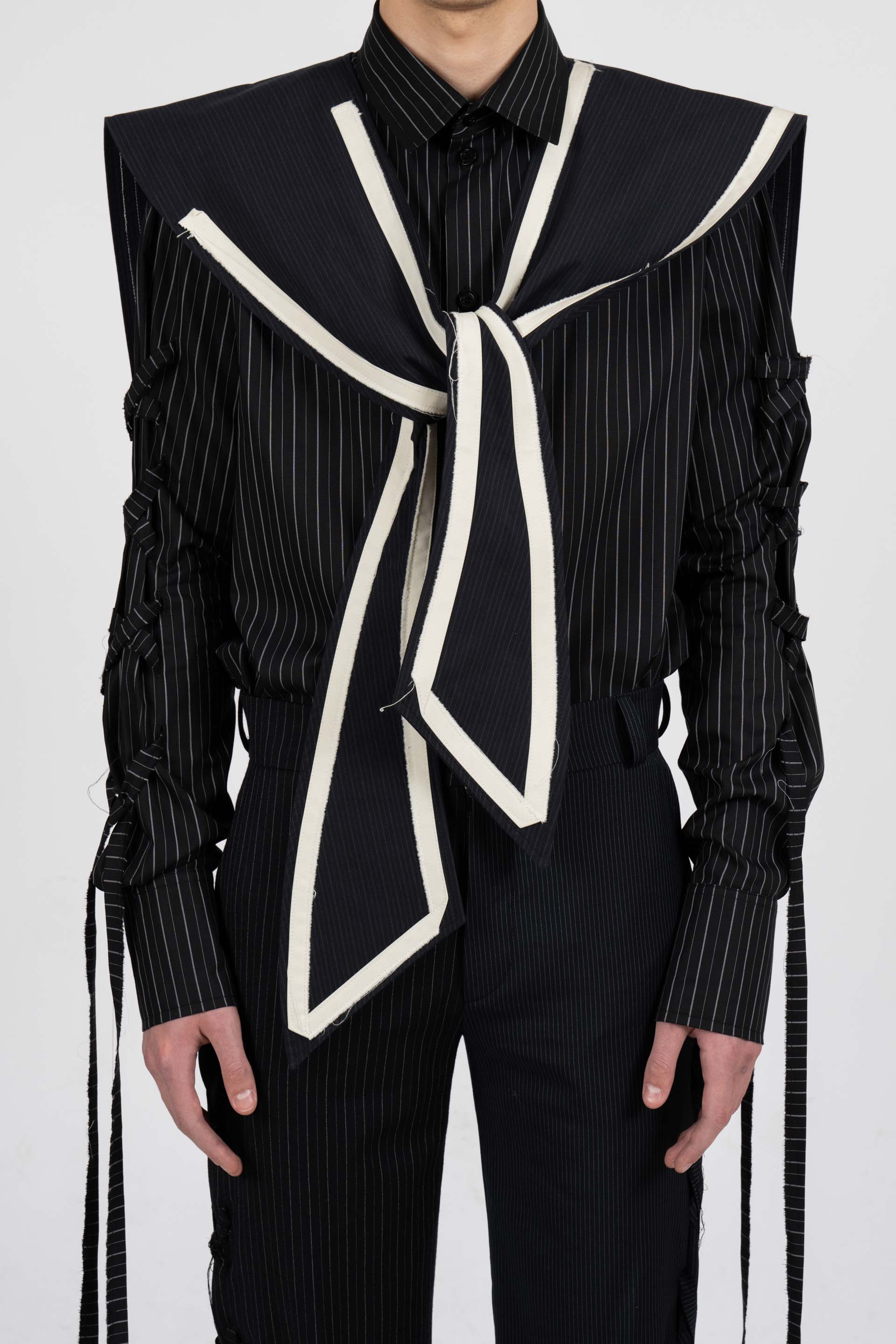 Marama od tamnoplavog prugastog debljeg popelina s kontrastnim prišivenim trakama.