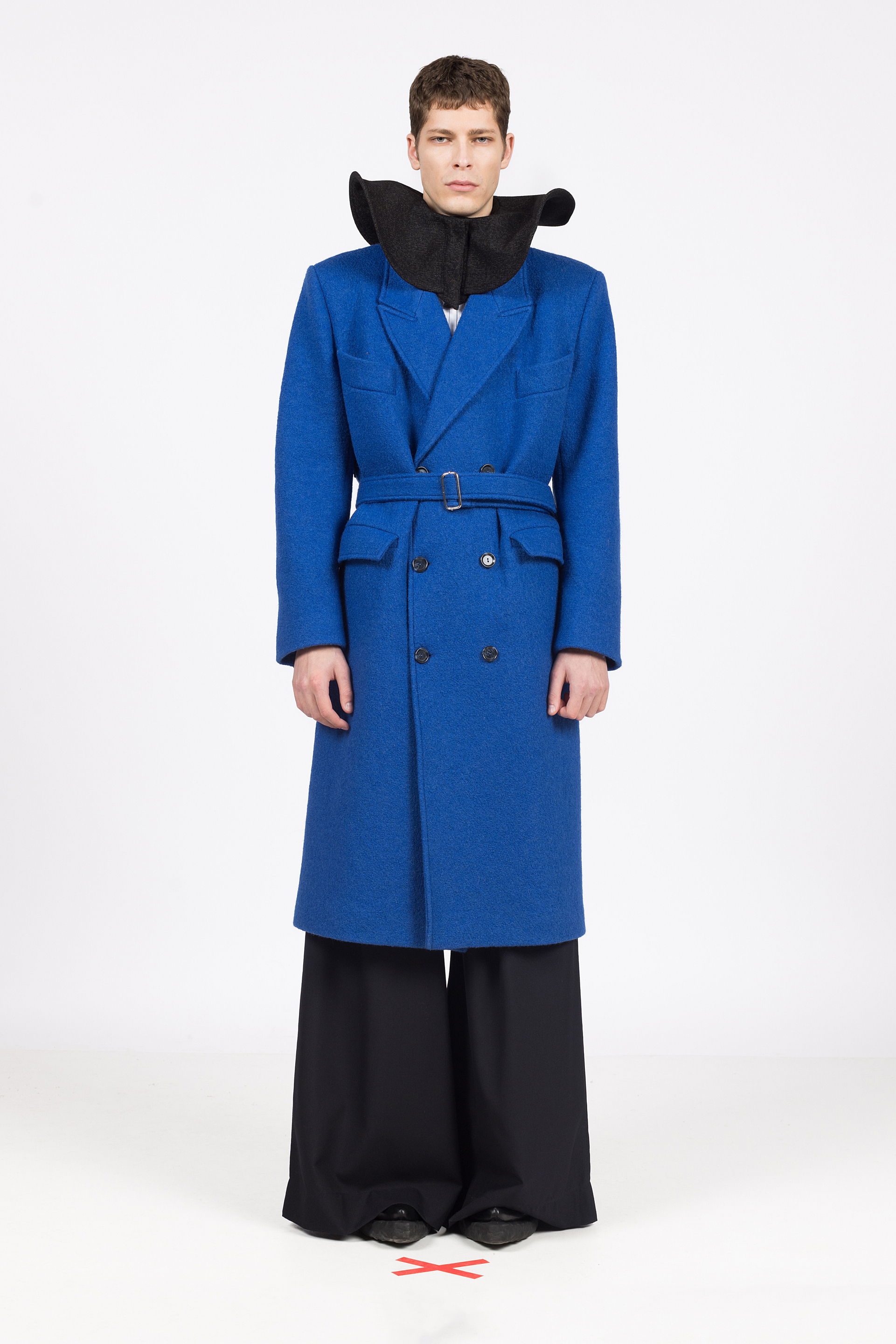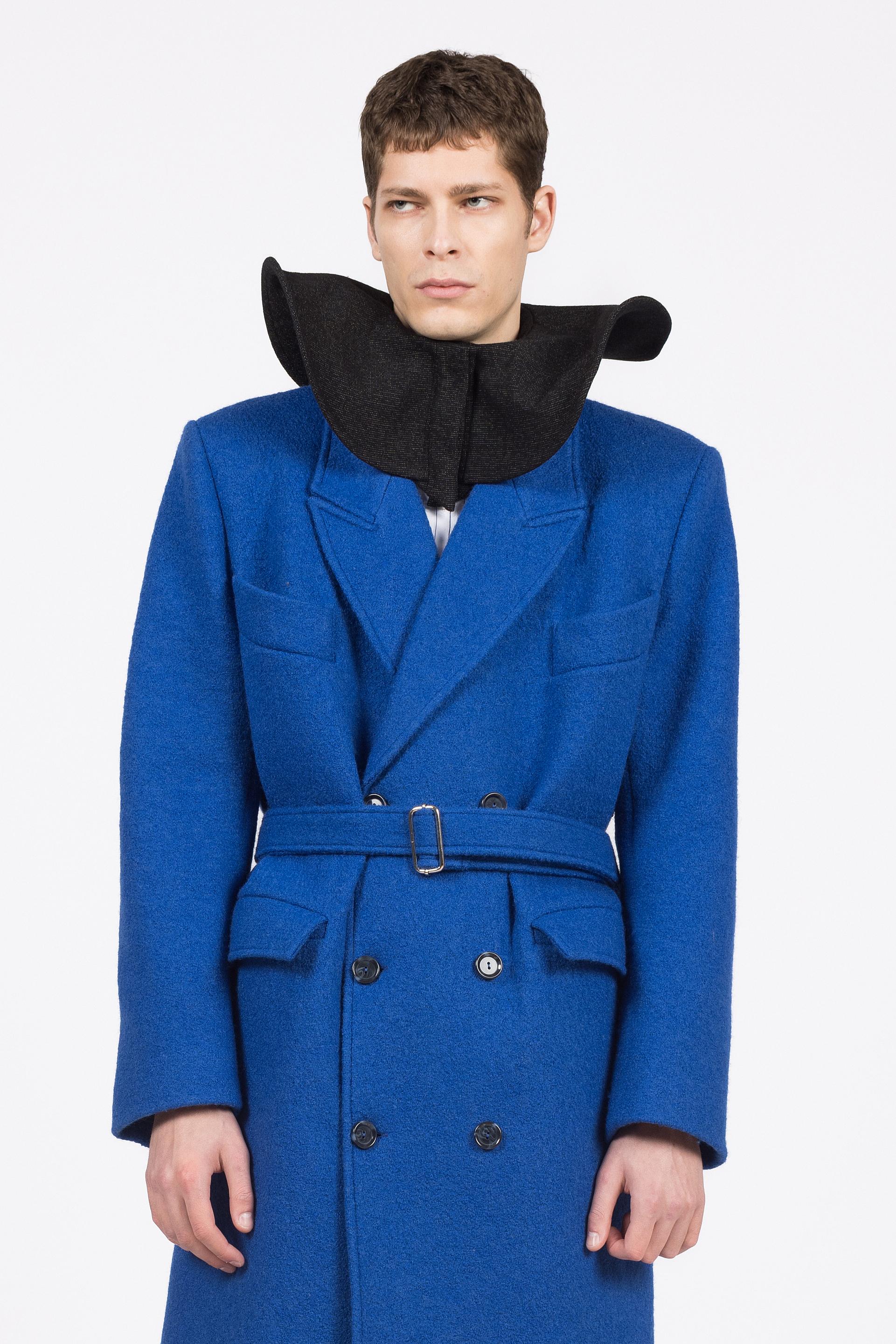 Predimenzionirani ovratnik skulpturalno oblikovanih i zaobljenih linija. Izrađen od crnog vunenog štofa mikro uzorka. Skriveno kopčanje metalnim drukerima.