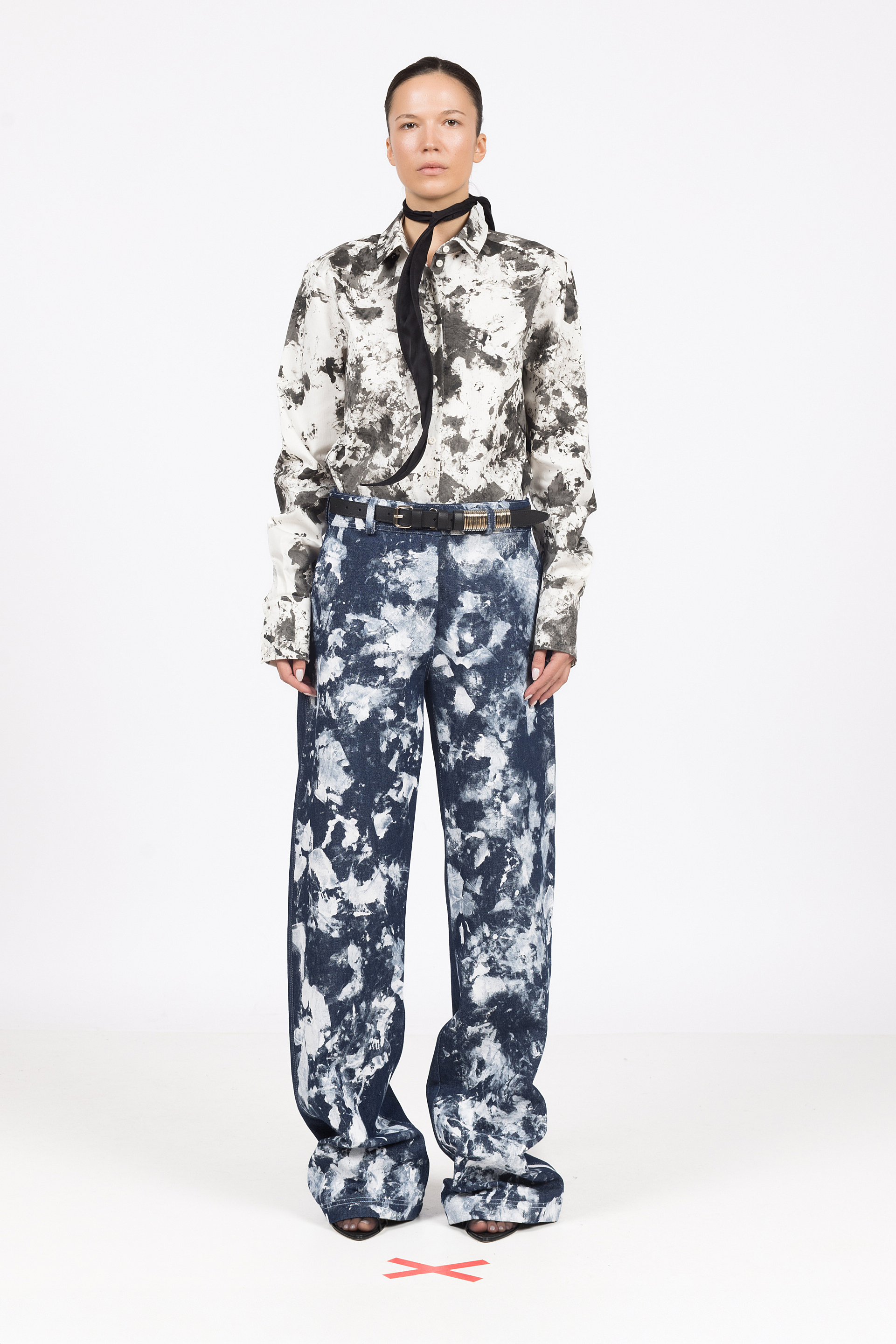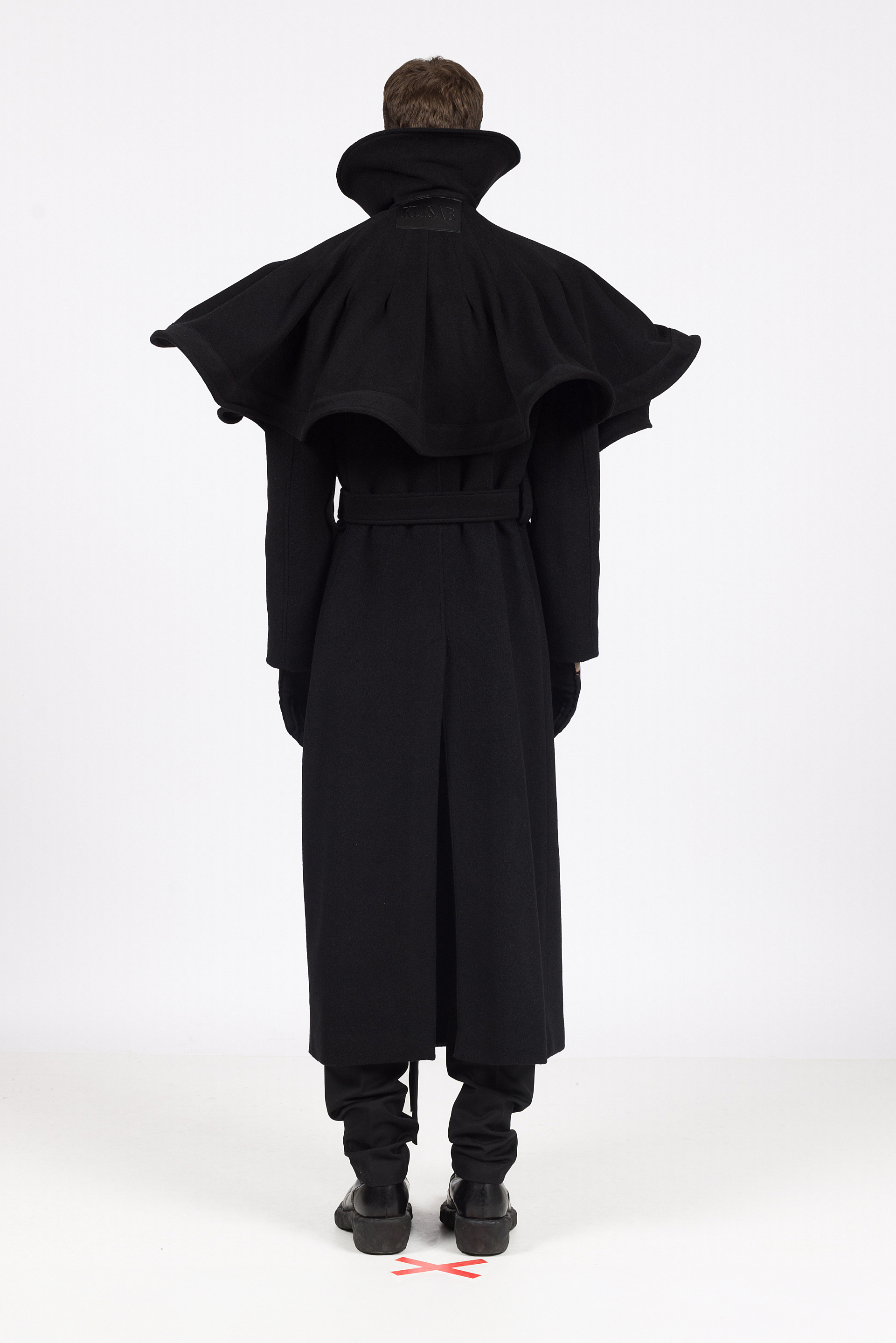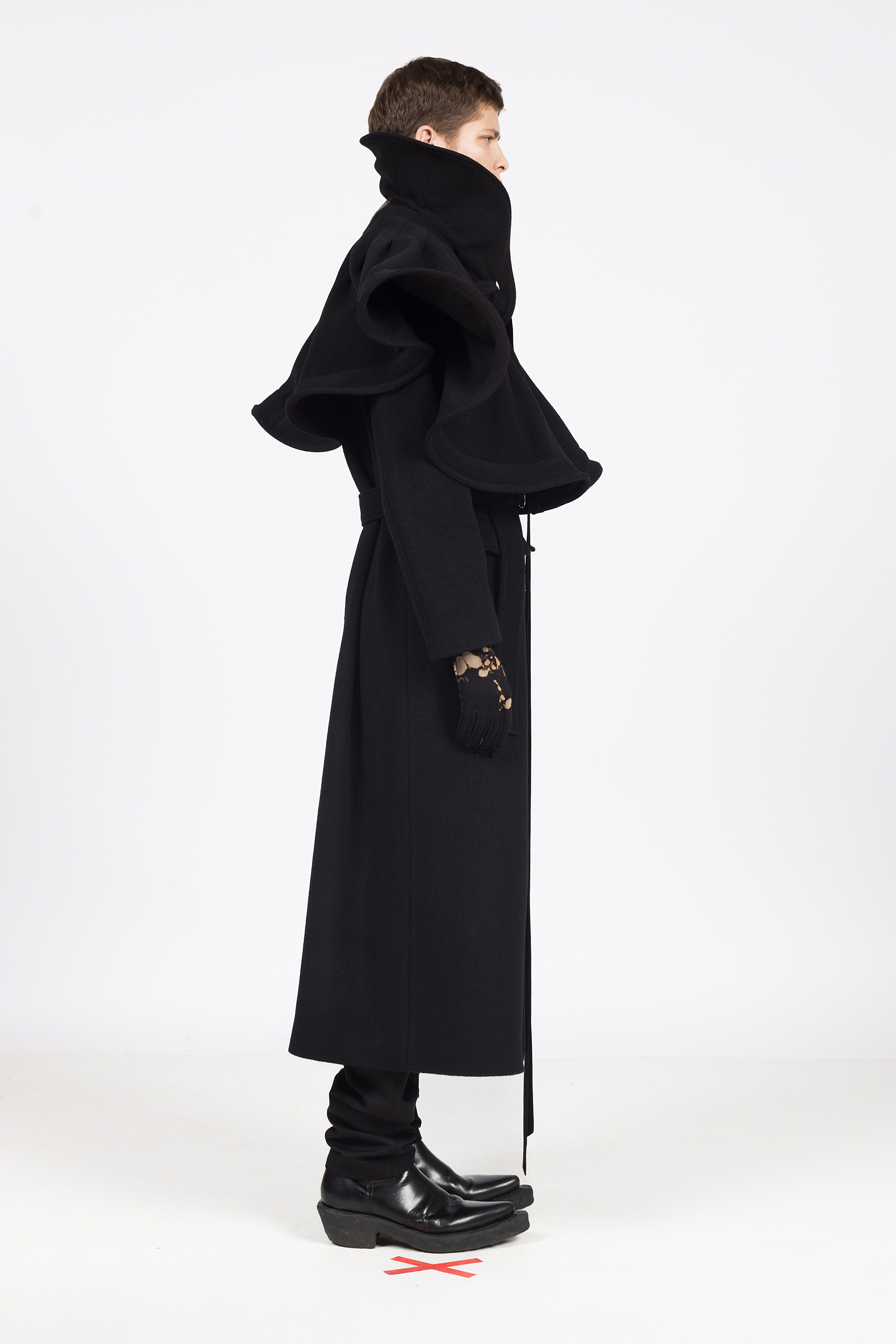 Skulpturalna pelerina izrađena od vunenog štofa crne boje, oblikovana u kružnu formu s naglašenim volumenom u predijelu vrata. Vezanje dugom trakom provučenom kroz visoki ovratnik.