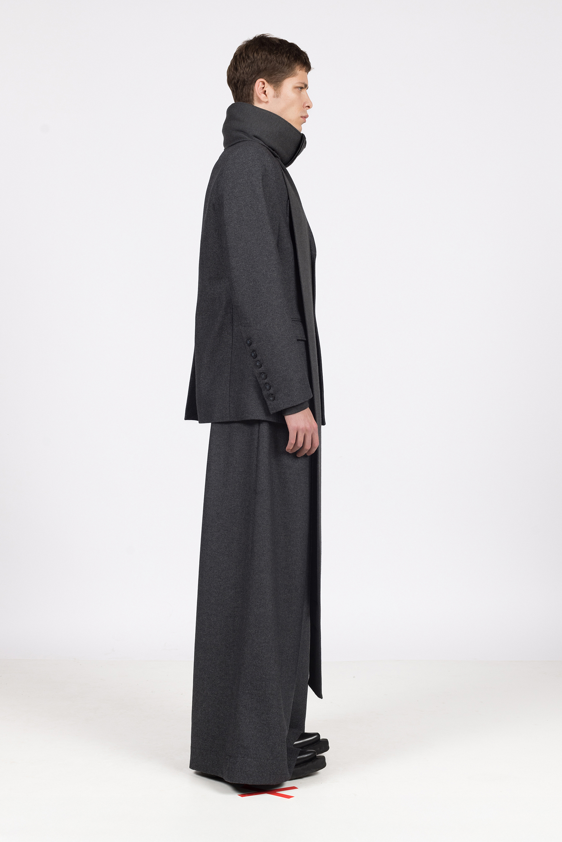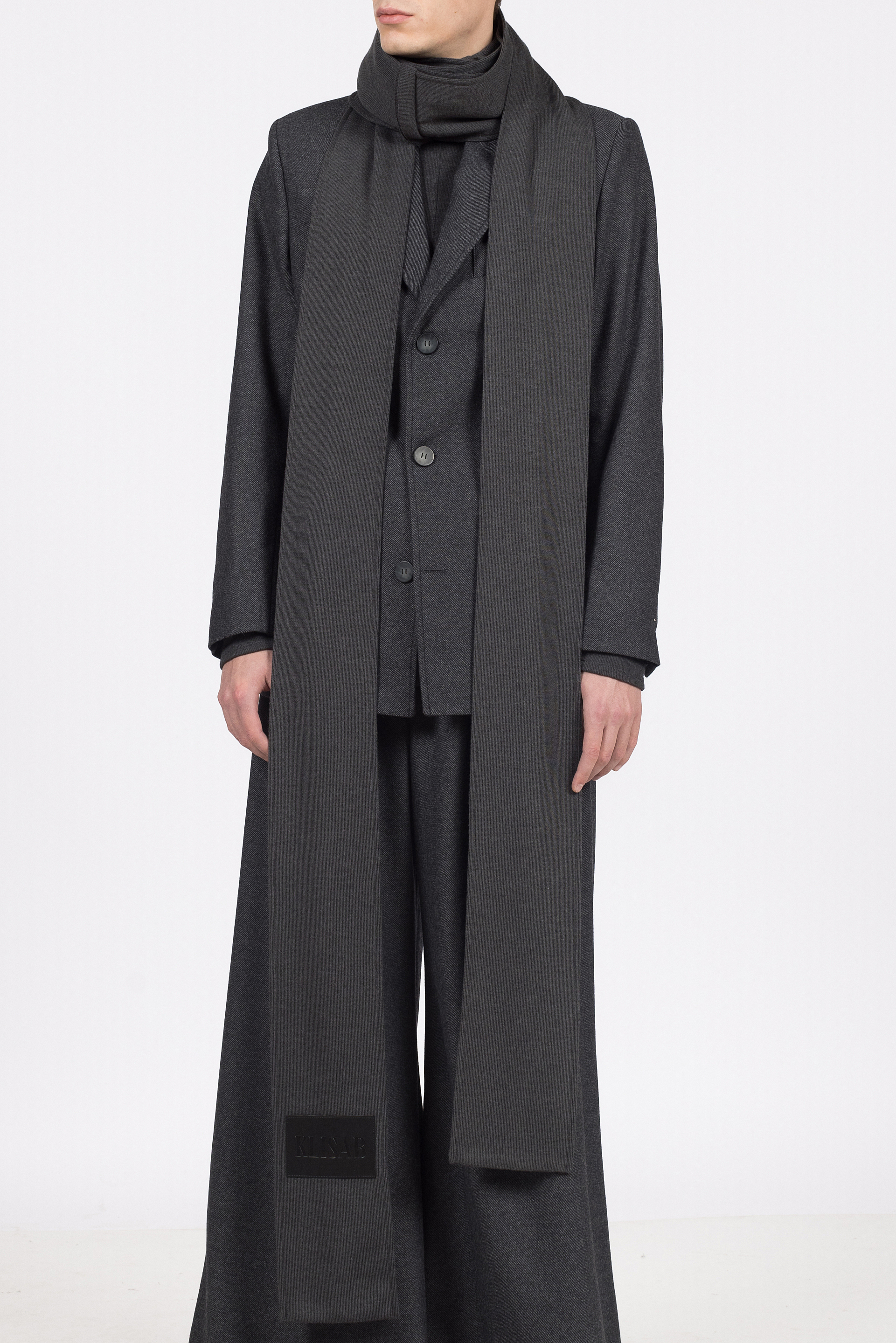 Šal izrađen od pletenine sive boje, predimenzionirane forme duge 5,30m.