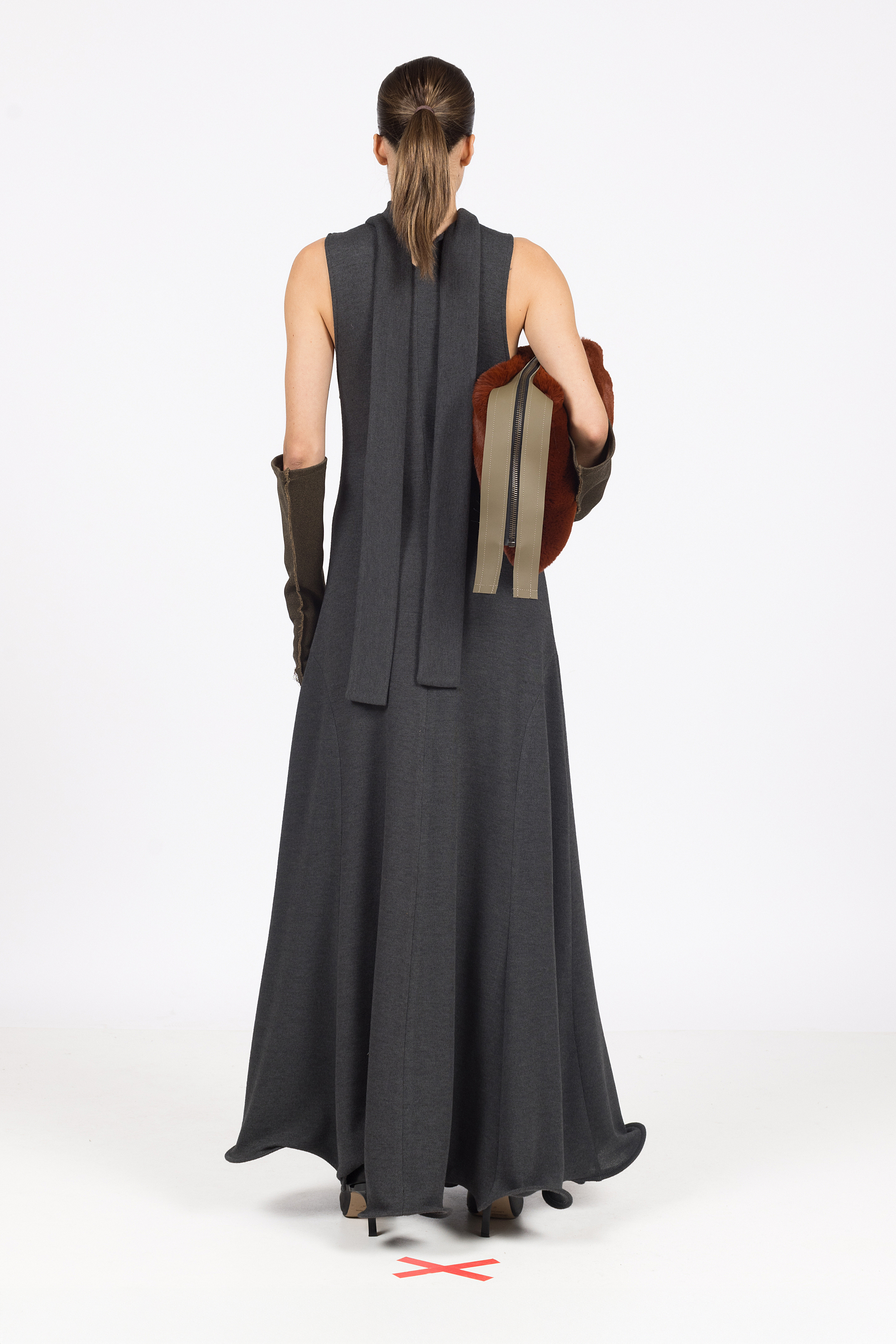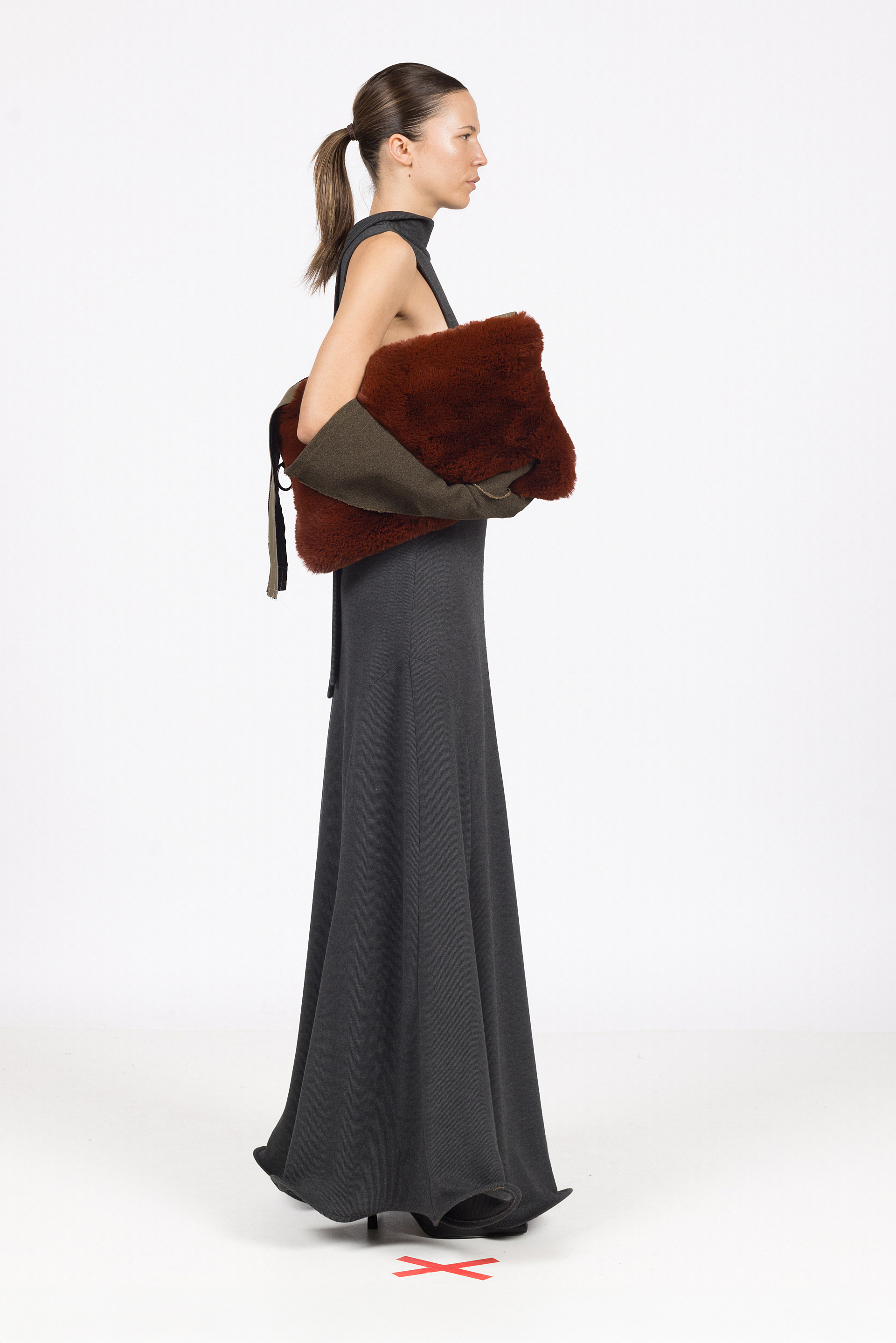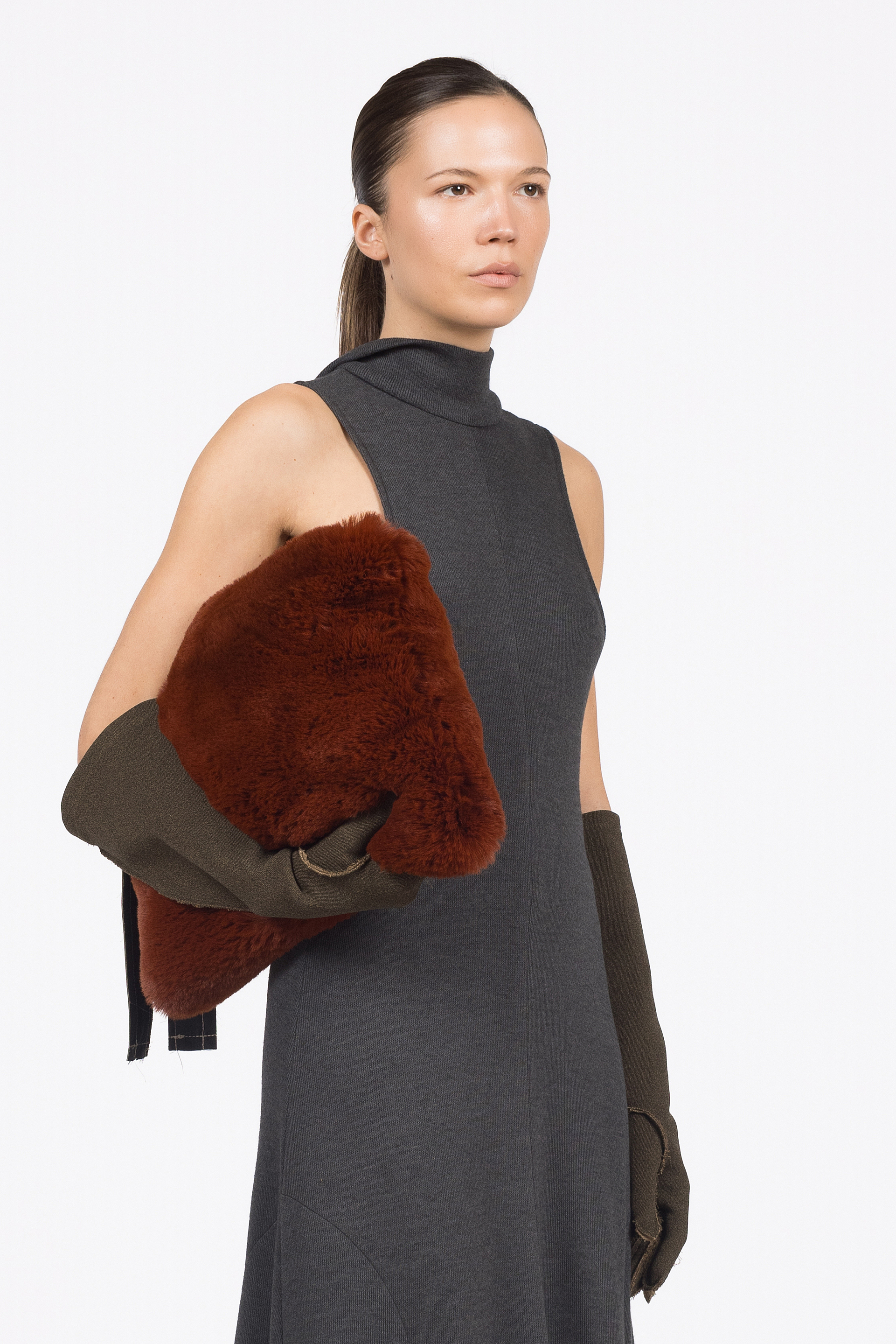 Clutch torba izrađena od umjetnoga krzna duge dlake u nijansi terakote. Model predimenzionirane forme s patentnim zatvaračem s kožnatim dijelom u maslinastoj boji.